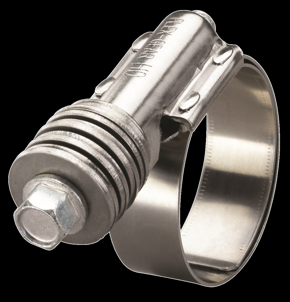 Constant Torque Clamps provide variable tension (using a spring mechanism) for hoses and systems seeing high temperature range fluctuations. They keep the hose from leaking at low temperature and high as the system cycles through various stages and ambient temperatures.